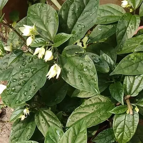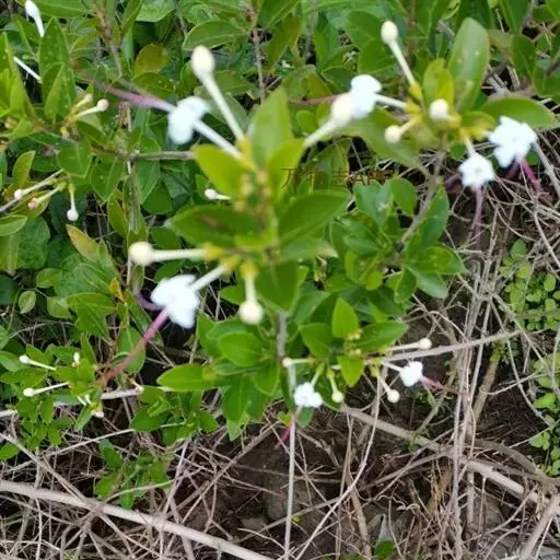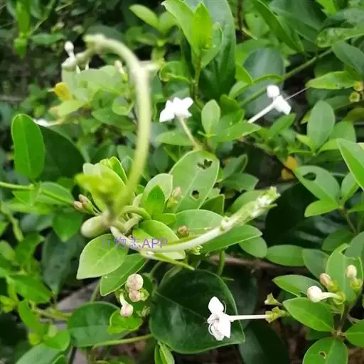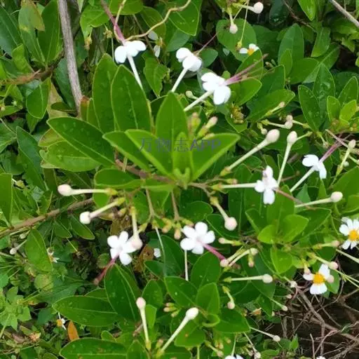 叶对生,薄革质,卵形、椭圆形或椭圆状披针形、卵状披针形,长3-7厘米,宽1.5-4.5厘米,顶端钝尖,基部楔形或宽楔形,全缘,常略反卷,表面深绿色,背面淡绿色,无毛或背面沿脉疏生短柔毛,两面都散生黄色细小腺点,干后褪色或脱落而形成小浅窝,侧脉4-7对,近叶缘处向上弯曲而相互汇合;叶柄长约1厘米;聚伞花序通常由3朵花组成,少为2次分歧,着生于叶腋或枝顶叶腋;花很香,花序梗长2-4厘米;苞片线形,长约2毫米,对生或近于对生;花萼钟状,外被细毛,顶端微5裂或在果时几平截,萼管长约7毫米;花冠白色,顶端5裂,裂片长椭圆形,长约7毫米,花冠管长2-3厘米,外面几无毛,有不明显的腺点,内面密生绢状柔毛;雄蕊4,偶见6,花丝紫红色,细长,与花柱同伸出花冠,花柱较花丝长或近等长,柱头2裂。