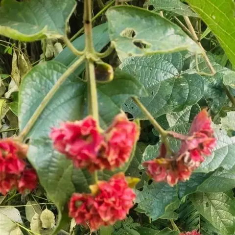 攀援状灌木,直立或平卧,高可达2米;根、茎、叶有苦味;幼枝 苦郎树 四棱形,黄灰色,被短柔毛;小枝髓坚实。