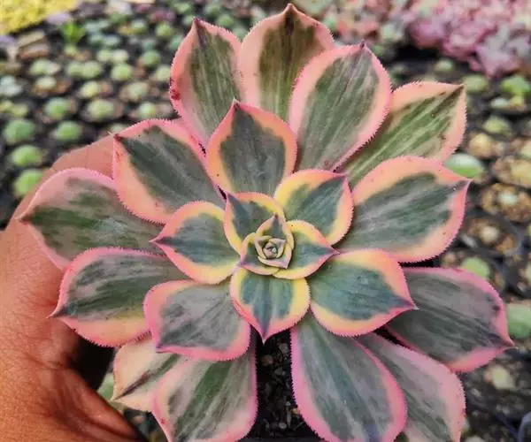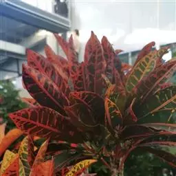 花叶木薯叶片掌状深裂,绿色叶面镶嵌黄色斑块,红色叶柄,显得十分绚丽,是非常耐看的观叶植物。