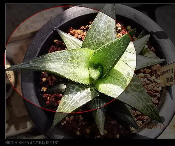 肉质叶排列成莲座状,无茎,株幅6-10cm,具叶10-15片。叶5cm,基部宽2-2.8cm,阔卵状三角形,叶端具小尖,外弯伸展,肉质,坚硬,暗绿色,背面稍红。叶面扁平,无毛,透明,具5-7条纵线及短横线,组成方格斑纹。叶背有排列不规则的小的色疣状突起,叶缘具细白齿 。