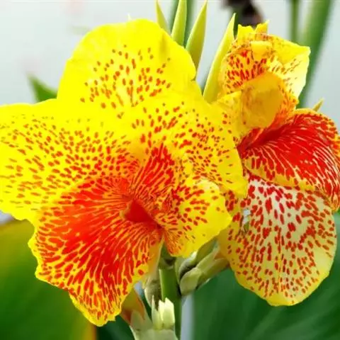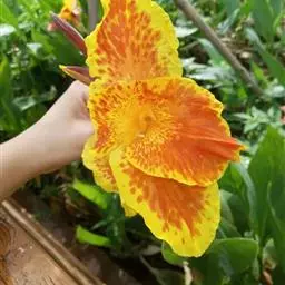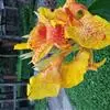引自南美,是美人蕉属类中少见稀世珍品,因在同一枝花茎上争奇斗艳、开出大红与五星艳黄两种颜色的花而得名,更具观赏价值的是花瓣红黄各半,同株异渲。更奇之处是红花瓣上点缀着鲜黄星点,五星黄花瓣装点着鲜红光斑。双色鸳鸯美人蕉株矮状,叶节密生,叶片大而浓绿,四片叶时即可现蕾开花。是盆栽佳品,也适宜城区、旅游景区、生活区、公园及行道绿化。