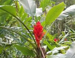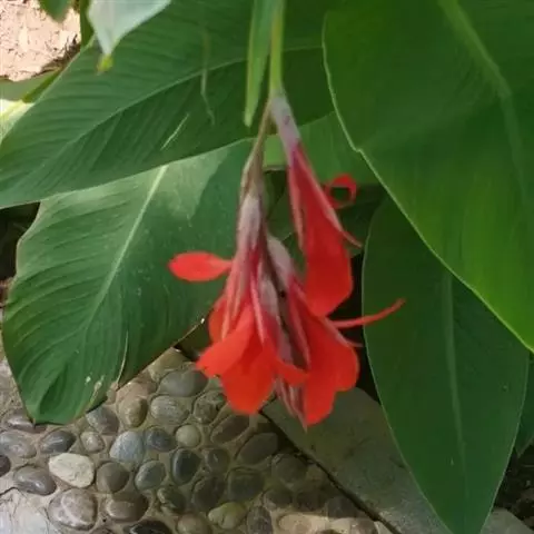 美人蕉(学名:Canna indica L.):多年生草本植物,高可达1.5米,全株绿色无毛,被蜡质白粉。具块状根茎。地上枝丛生。单叶互生;具鞘状的叶柄;叶片卵状长圆形。总状花序,花单生或对生;萼片3,绿白色,先端带红色;花冠大多红色,外轮退化雄蕊2-3枚,鲜红色;唇瓣披针形,弯曲;蒴果,长卵形,绿色,花、果期3-12月。