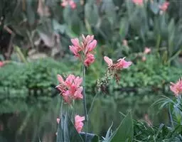 粉美人蕉:是一种球根草本植物。根茎延长,株高1.5-2米;茎绿色。叶片披针形;总状花序疏花,单生或…