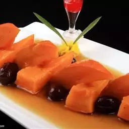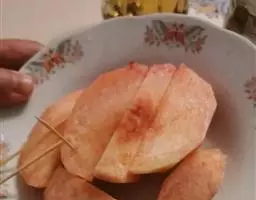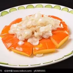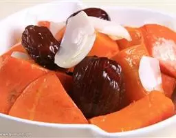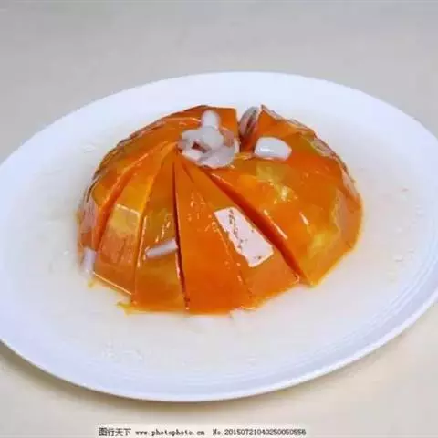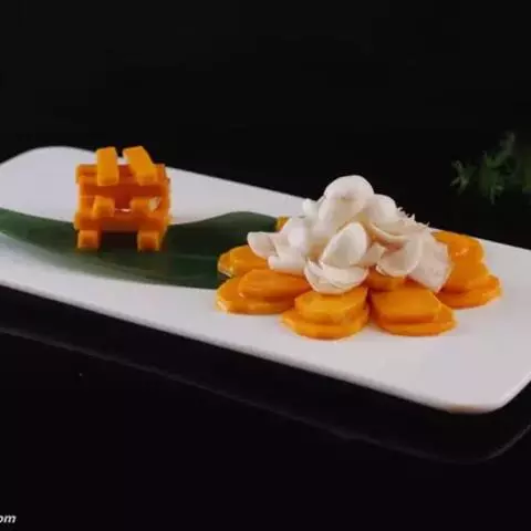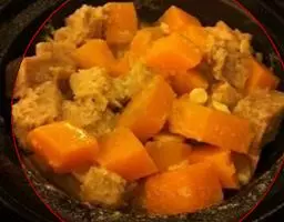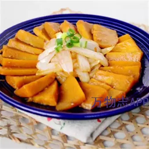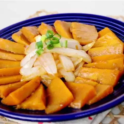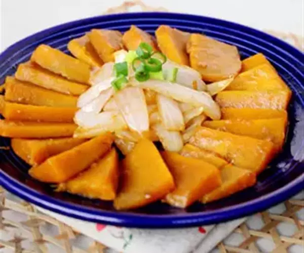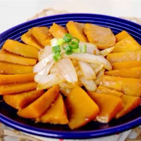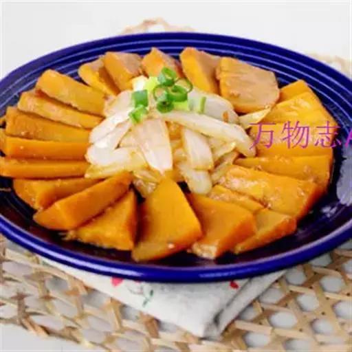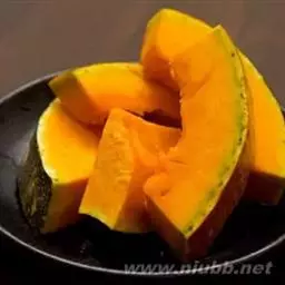 一南瓜切成五六厘米的薄片,放在微波炉内高火,时间视南瓜的多少而定,直到南瓜八九分熟