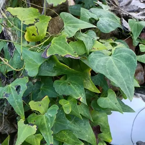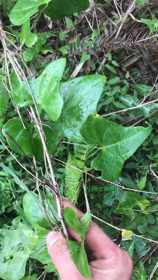 缠绕草质藤本。根状茎横生,近圆柱形,指状或不规则分枝,新鲜时外皮棕褐色,断面黄色,干后除去须根常留有白色点状痕迹。茎左旋,光滑无毛,有时在分枝或叶柄基部两侧微突起或有刺。单叶互生;叶片厚纸质,三角状卵形、心形或箭形,通常3浅裂至3深裂,中间裂片三角状卵形或披针形,两侧裂片圆耳状或长圆形,两面光滑无毛,表面绿色,常有不规则斑块,干时呈灰褐色;叶柄盾状着生。