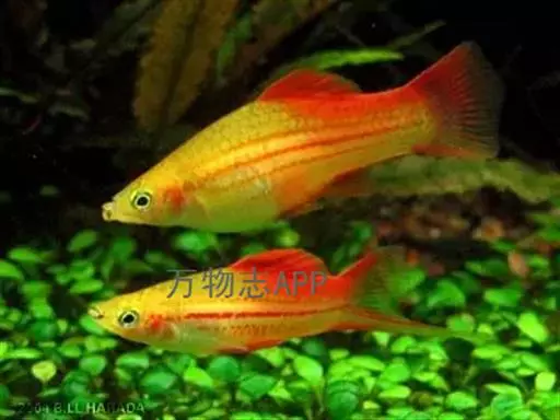 剑尾鱼 剑尾鱼剑鱼6~8月龄性成熟,雌雄鱼很容易识别,雌鱼除无剑尾外较雄体略为肥大;雄鱼各鳍较尖,臀鳍前部分鳍条演化成输精器。成熟亲鱼在适温时期,每隔4~5周繁殖一次,每次产仔鱼20~30尾,多的近百尾,适宜繁殖的水质硬度6~9度、pH7~7.2。