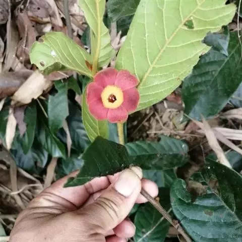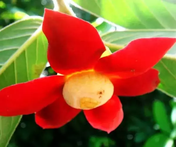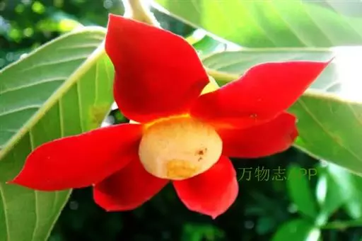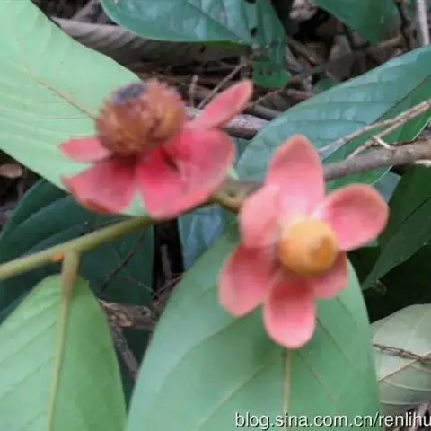 全株密被黄褐色绒毛,叶互生,长倒卵形;花较大,6玫花瓣排列成2轮,紫红色或深红色,数量众多的雄蕊、雌蕊聚生于花瓣中间,宛若紫色玉盘上盛放着的黄色水晶。花虽藏于叶背开放,却难掩其艳丽的姿容,常于万绿丛中透出点点惹眼的红色,若是凑近细闻,更有淡淡的芳香。花后结果,果光滑,长圆柱状,酷似辣椒,聚生于“果盘”上,果实向四面八方伸展,到成熟时分变成橙黄色,齐指向地面,甚是诱人。