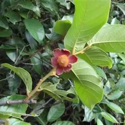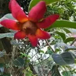 大花紫玉盘(Uvaria grandifloraRoxb.)就是一种典型能用叶、花、果实等感知外界气温变化的奇花异果植物。这种植物分布在中国广东中南部、广西东南部、南亚、东南亚等一些国家热带、亚热带地区。其性状为灌木状藤本,开花时,花瓣6片,呈内外两轮排列,紫红色至深红色,花大艳丽,有香味。果实聚合生于一个果柄上,单果多达20数以上。幼果至熟果颜色从绿色—灰褐色—橙黄色渐变。