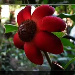 华南植物园繁育中心种植着一种花艳果奇的植物—大花紫玉盘(Uvaria grandiflora Roxb.)。该植物又名山椒子、川血乌、红肉梨,为番荔枝科攀援灌木。