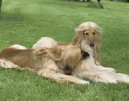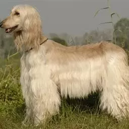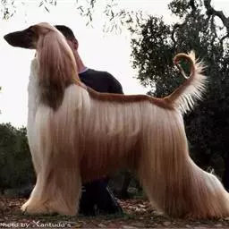 阿富汗猎犬全身披丝绢状的长毛,毛色鲜艳,呈多种颜色,背中线附近毛短,…
