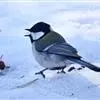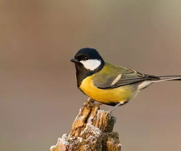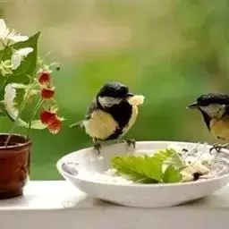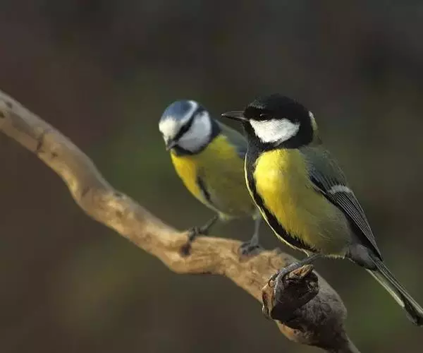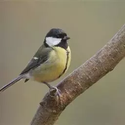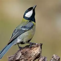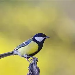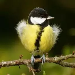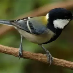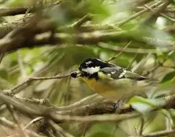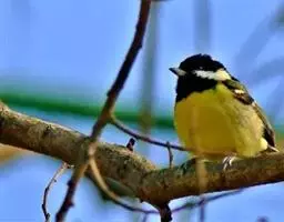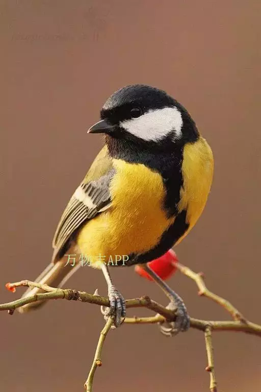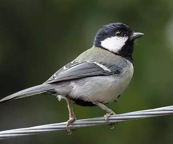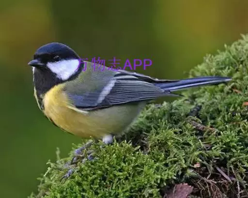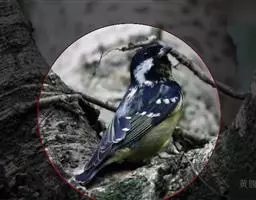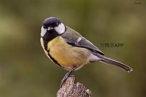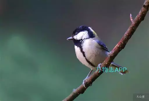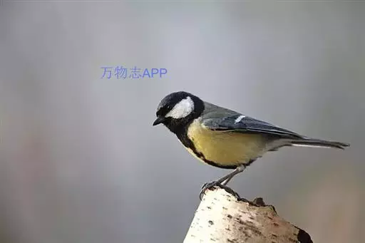 大山雀(学名:Parus major):中小型鸟类,体长13-15厘米。整个头呈黑色,头两侧各有一大型白斑,喙呈尖细状,便于捕食。上体为蓝灰色,背沾绿色。下体白色,胸、腹有一条宽阔的中央纵纹与颏、喉黑色相连。