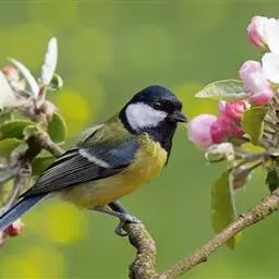 大山雀是各地山林、果园里极为常见的一种小鸟。它的个子比麻雀略小,头部呈光泽的蓝黑色,衬托着洁白的两颊,好像京剧脸谱中的大白脸,所以又称白脸山雀。它的背面为蓝灰色,腹面白色,中央纵贯着宽阔的黑纹。