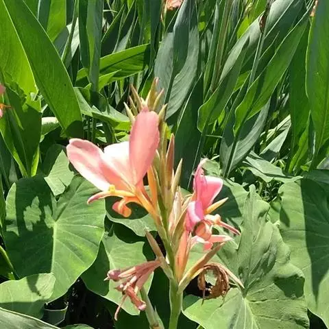兰花美人蕉(学名:Canna orchioides Bailey):是多年生球根草本植物。株高1-1.5米;茎绿色。叶片椭圆形至椭圆状披针形。总状花序通常不分枝;花大,直径10-15厘米;花冠裂片披针形,鲜黄至深红,具红色条纹或溅点,无纯白或粉红色;花期:夏、秋。为园庭观赏植物。