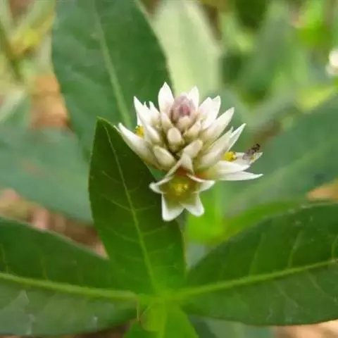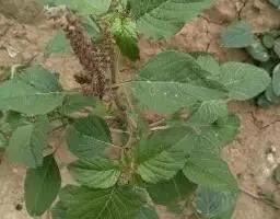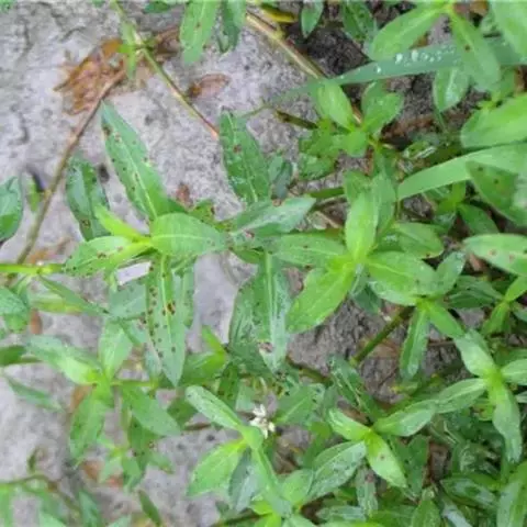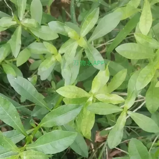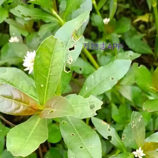 喜旱莲子草 多年生草本;茎基部匍匐,上部上升,管状,不明显4棱,长55-120厘米,具分枝,幼茎及叶腋有白色或锈色柔毛,茎老时无毛,仅在两侧纵沟内保留。叶片矩圆形、矩圆状倒卵形或倒卵状披针形,长2.5-5厘米,宽7-20毫米,顶端急尖或圆钝,具短尖,基部渐狭,全缘,两面无毛或上面有贴生毛及缘毛,下面有颗粒状突起;叶柄长3-10毫米,无毛或微有柔毛。