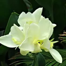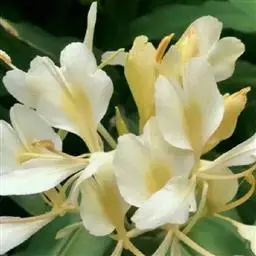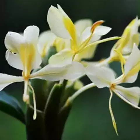 姜花象征纯朴。它一枝挺拔,一个花苞开出五、六朵洁白泛黄的花儿,每朵有三片花瓣,宛如翩翩白蝶,聚集于翡翠簪头,从朝到暮,喷放清香。故欧美把姜花称作“蝴蝶百合”。