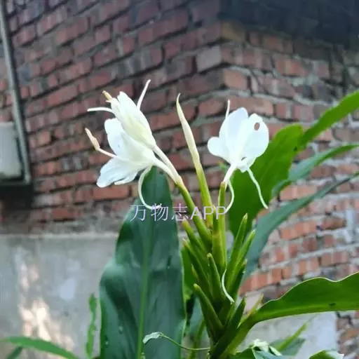 穗状花序顶生,椭圆形,长10-20厘米,宽4-8厘米;苞片呈覆瓦状排列,卵圆形,长4.5-5厘米,宽2.5-4厘米,每一苞片内有花2-3朵;花芬芳,白色,花萼管长约4厘米,顶端一侧开裂;花冠管纤细,长8厘米,裂片披针形,长约5厘米,后方的1枚呈兜状,顶端具小尖头;侧生退化雄蕊长圆状披针形,长约5厘米;唇瓣倒心形,长和宽约6厘米,白色,基部稍黄,顶端2裂;花丝长约3厘米,花药室长1.5厘米;子房被绢毛。