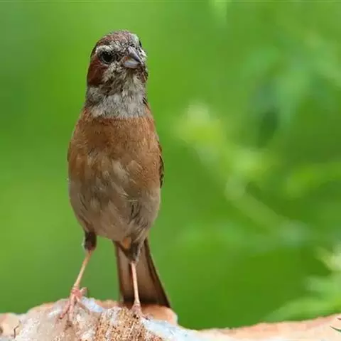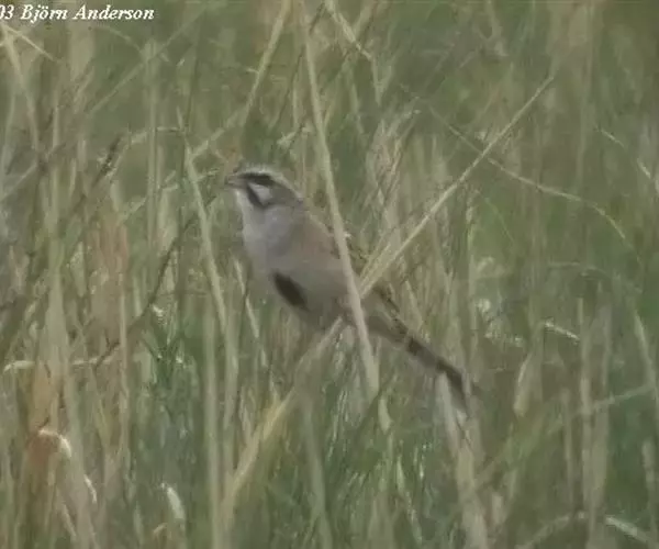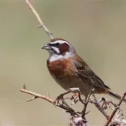 栗斑腹鹀(学名:Emberiza jankowskii):属小型鸣禽。体重19-25克,体长145-167毫米。头顶至背栗红色,眼先和颧纹黑褐色,黑色颧纹上还有一白纹,耳羽褐色或灰褐色,眉纹白色或灰白色。背、肩具黑色纵纹,腰至尾上覆羽砖红色无纵纹,两翅和尾羽黑褐色,两对外侧尾羽具楔状白班。下体污白色或灰白色,腹中央有一明显的心脏形栗色大斑。喙为圆锥形,与雀科的鸟类相比较为细弱,上下喙边缘不紧密切合而微向内弯,因而切合线中略有缝隙;体形和羽色近似三道眉草鹀,唯体色棕栗。