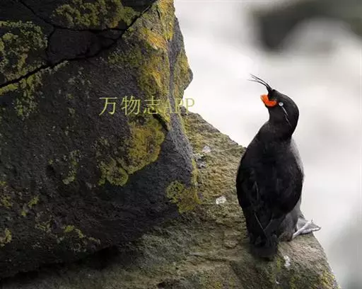 凤头海雀(学名:Aethia cristatella ):体重211-322克,体长18-20厘米,是鸻形目海雀科的一种海鸟,前趾间有蹼膜,后趾缺如。翅窄而短小,尾短。是海鸟中体型相对较小的鸟类。雌雄羽色相似。身体羽毛上体深灰色,下体通常是棕灰色。头顶面部有装饰性的向前卷曲的羽冠,雄鸟鸟喙上有颜色鲜艳的“角质”板,称为鼻板。虹膜白色,头的两侧各有一条白色羽纹,从眼睛后面一直延伸到耳朵。腿灰色,脚上有蹼呈煤黑色。鸟喙亮红橙色,尖端是黄色。