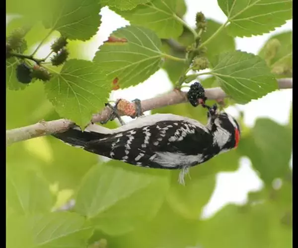 作为最小的北美洲啄木鸟,绒啄木鸟能在死去的树木上啄约10cm大小的洞,这意味着它在可居住的地方是比大的啄木鸟有更大的范围。绒啄木鸟的食物多为昆虫,在春夏间,你会很容易听到他们“敲打”树木的声音。