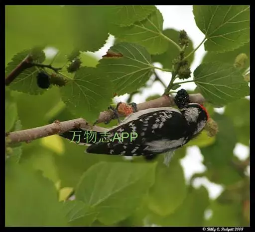 绒啄木鸟,北美洲最小的啄木鸟,白腹黑背和黑项,黑翼上有白色斑点。头部有黑白相间的条纹,尾巴短小,雄…