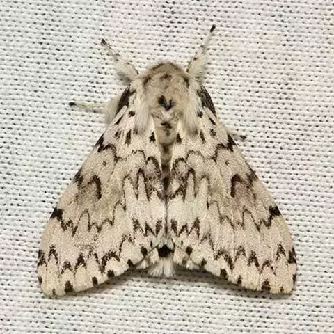 成虫雌雄异型. 雄成虫:体长约20毫米,前翅茶褐色,有4、5条波状横带,外缘呈深色带状,中室中央有一黑点。 雌虫:体长约25毫米,前翅灰白色,每两条脉纹间有一个黑褐色斑点。腹末有黄褐色毛丛。卵:圆形稍扁,直径1.3毫米,初产为杏黄色,数百粒至上千粒产在一起成卵块,其上覆盖有很厚的黄褐色绒毛。幼虫:老熟时体长50-70毫米,头黄褐色有八字形黑色纹。前胸至腹部第二节的毛瘤为蓝色,腹部第三-九节的7对毛瘤为红色。蛹:体长19~34mm,雌蛹大,雄蛹小。体色红褐或黑褐色,被有锈黄色毛丛。