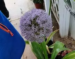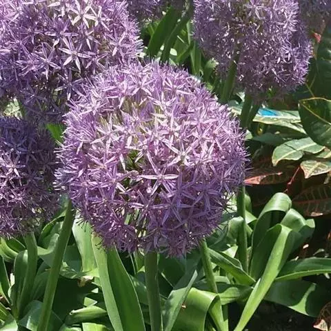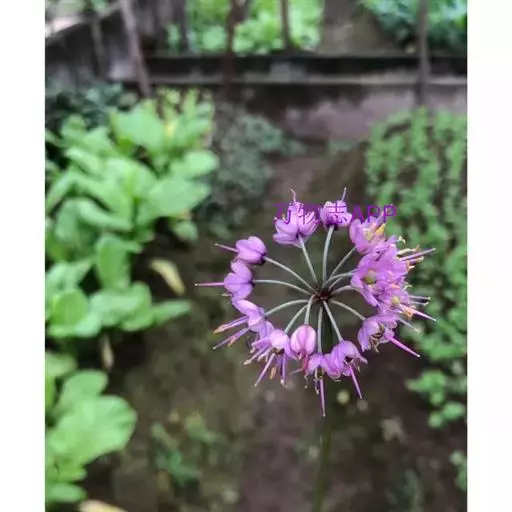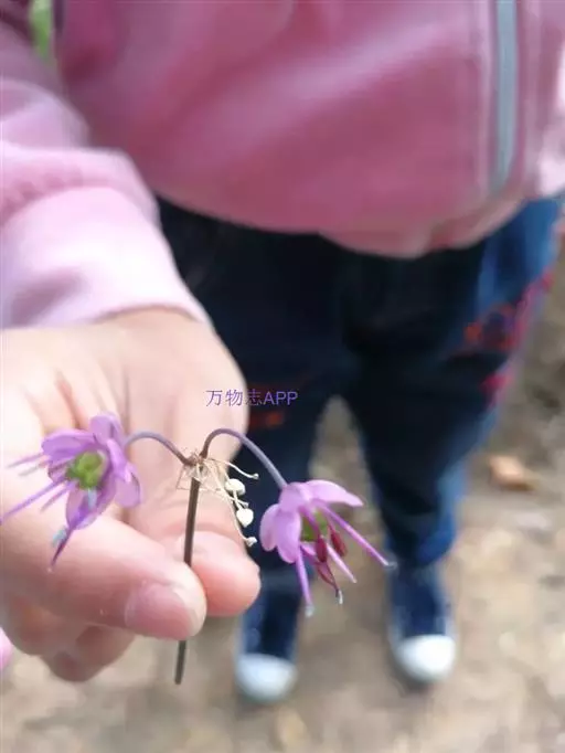 花葶侧生,圆柱状,高20-40厘米,下部被叶鞘;总苞2裂,比伞形花序短;伞形花序近半球状,较松散;小花梗近等长,比花被片长1-4倍,基部具小苞片;花淡紫色至暗紫色;花被片宽椭圆形至近圆形,顶端钝圆,长4-6毫米,宽3-4毫米,内轮的稍长;花丝等长,约为花被片长的1.5倍,仅基部合生并与花被片贴生,内轮的基部扩大,扩大部分每侧各具1齿,外轮的无齿,锥形;子房倒卵球状,腹缝线基部具有帘的凹陷蜜穴;花柱伸出花被外。花果期为10-11月。