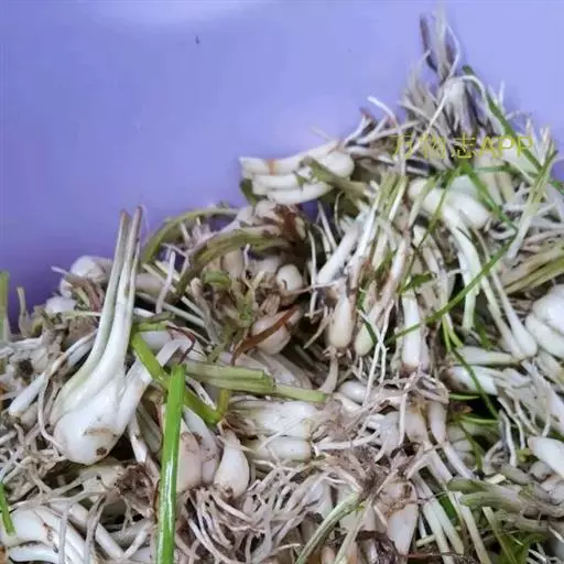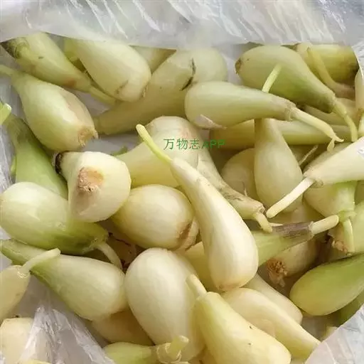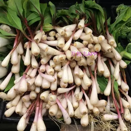 鳞茎数枚聚生,狭卵状, 藠头 粗(0.5-)1-1.5(-2)厘米;鳞茎外皮白色或带红色,膜质,不破裂。