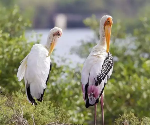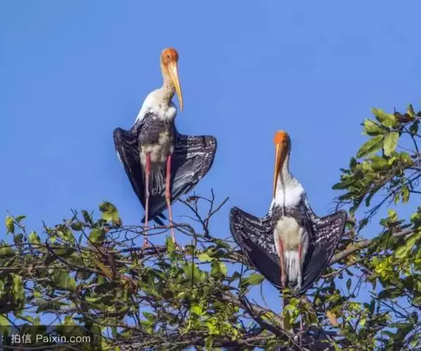 白头鹮鹳(学名:Mycteria leucocephalus),又叫彩鹳,为鹳形目鹳科鹮鹳属的鸟类。羽色美丽,姿态优美,体长93-102厘米,体重2-3.5千克,寿命最高可达28年以上。橙黄色的嘴粗而长,但嘴尖稍微向下弯曲。脚为红色,也特别长,胫的下部裸出。橙色的头部赤裸无羽,繁殖期变为红色。体羽主要为黑色和白色,其中飞羽、尾羽为黑色,具有绿色的金属光泽,胸部具有宽阔的黑色胸带,也具有绿色的金属光泽,其余体羽均为白色。虹膜为淡黄色或褐色。