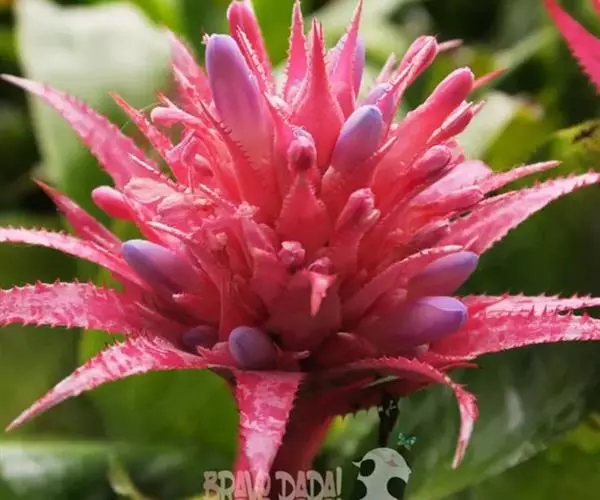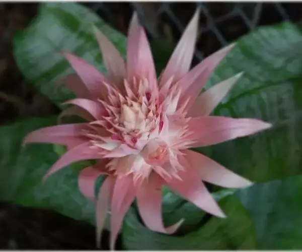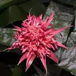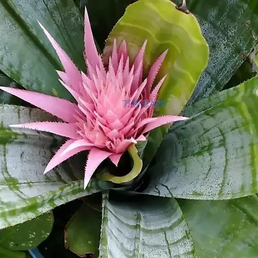 美叶光萼荷(Aechmea fasciata (Lindl.) Baker)凤梨科多年生附生常绿草本植物。莲座状叶丛相互套叠成筒状。叶长达60厘米,革质,被灰色鳞片,绿色,有虎纹状银白色横纹,边缘有黑色小刺。花莛直立,花序穗状,有分枝,花多数。苞片革质,淡红色或深红色。小花无柄,淡蓝色。冬季开花。