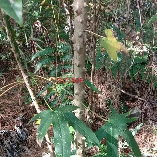 刺楸 刺楸(原变种)落叶乔木,高约10米,最高可达30米,胸径达70厘米以上,树皮暗灰棕色;小枝淡黄棕色或灰棕色,散生粗刺;刺基部宽阔扁平,通常长5-6毫米,基部宽6-7毫米,在茁壮枝上的长达1厘米以上,宽1.5厘米以上。叶片纸质,在长枝上互生,在短枝上簇生,圆形或近圆形,直径9-25厘米,稀达35厘米,掌状5-7浅裂,裂片阔三角状卵形至长圆状卵形,长不及全叶片的1/2,茁壮枝上的叶片分裂较深,裂片长超过全叶片的1/2,先端渐尖,基部心形,上面深绿色,无毛或几无毛,下面淡绿色,幼时疏生短柔毛,边缘有细锯齿,放射状主脉5-7条,两面均明显;叶柄细长,长8-50厘米,无毛。