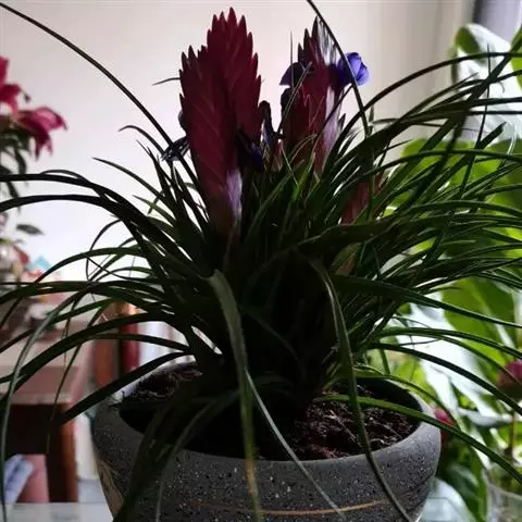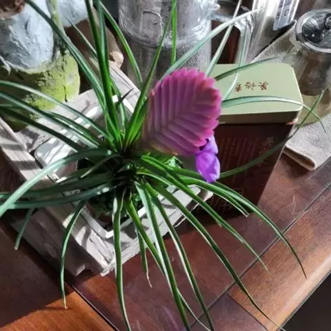 紫花凤梨,是凤梨科铁兰属的多年生草本植物。株高不及30厘米;叶片拱状线形,叶丛族生于短缩茎上,…