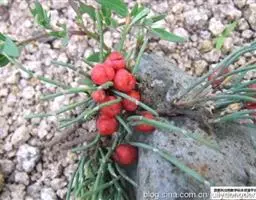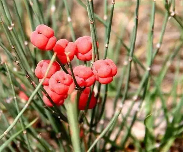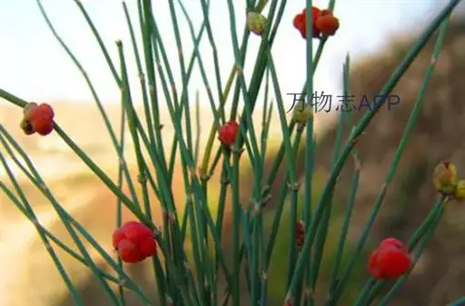 草本状灌木,高20-40厘米;木质茎短或成匍匐状,小枝直伸或微曲,表面细纵槽纹常不明显,节间长2.5-5.5厘米,多为3-4厘米,径约2毫米。叶2裂,鞘占全长1/3-2/3,裂片锐三角形,先端急尖。雄球花多成复穗状,常具总梗,苞片通常4对,雄蕊7-8,花丝合生,稀先端稍分离;雌球花单生,在幼枝上顶生,在老枝上腋生,常在成熟过程中基部有梗抽出,使雌球花呈侧枝顶生状,卵圆形或矩圆状卵圆形,苞片4对,下部3对合生部分占1/4-1/3,最上一对合生部分达1/2以上;雌花2,胚珠的珠被管长1毫米或稍长,直立或先端微弯,管口隙裂窄长,约占全长的1/4-1/2,裂口边缘不整齐,常被少数毛茸。雌球花成熟时肉质红色,矩圆状卵圆形或近于圆球形,长约8毫米,径6-7毫米;种子通常2粒,包于苞片内,不露出或与苞片等长,黑红色或、灰褐色,三角状卵圆形或宽卵圆形,长5-6毫米,径2.5-3.5毫米,表面具细皱纹,种脐明显,半圆形。花期5-6月,种子8-9月成熟。