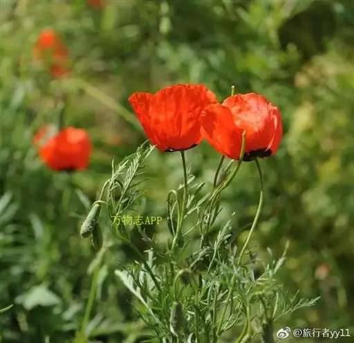 一年生草本,高20-40厘米。主根圆柱形,垂直,长达8厘米,少分枝。茎直立,圆柱形,具分枝,疏被灰黄色刚毛。基生叶多数,叶片轮廓卵形,长3-8厘米,二回羽状深裂,小裂片线形或线状长圆形,绿色,背面疏被刚毛,叶脉两面均明显;叶柄长3-8厘米,被灰黄色刚毛,基部扩大成鞘;茎生叶同基生叶,但较小和具短柄至近无柄。花单个顶生和腋生,具花梗,花梗长达14厘米,被紧贴、灰黄色刚毛;花芽卵圆形,长1.5-2厘米;尊片卵形,盔状,疏生刚毛;花瓣卵形至近圆形,长2-3厘米,鲜红色,基部约7毫米为暗紫色;雄蕊多数,花丝线形,长约1厘米,花药长圆形,长约1毫米;子房圆柱形,长1-1.8厘米,无毛,花柱短,柱头4裂片,下延。蒴果狭圆柱形,向上渐狭,长4-5厘米,无毛,柱头每2个裂片间具1个刚毛状附属物,附属物内弯并超出柱头,成熟时4瓣自顶端向基部开裂。种子多数,肾形,表面蜂窝状。花果期4-6月。