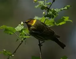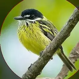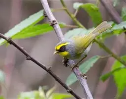 黑脸鹟莺:体长10厘米,是有特色的体小而多彩的莺鸟。粗眉纹,颏、喉及尾下覆羽黄色,脸罩黑,…