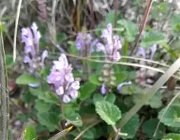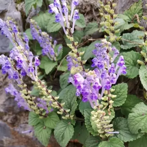 紫背黄芩,别名异色黄芩。为多年生草本;根茎匍匐,节上密生纤维状须根。茎上升或直立,连花序高5.5~38厘米,粗0.8~2毫米,四棱形,具槽,密被微柔毛,通常带红色,不分枝或间有花序分叉,近基部具叶且多少木质化,上部无叶。茎叶通常2~4对,罕有6~7对,密集于茎基部如基生叶状,或彼此远离,相隔1.6~3.5厘米,叶片坚纸质,椭圆形,卵圆形或宽椭圆形,长1.5~7.4厘米,宽1~4.8厘米,先端浑圆或钝,基部心形或浅心形,边缘具波状圆齿,上面绿色,密被极细的微柔毛间杂有短柔毛,下面绿色或常带紫色,有时灰绿色,被短柔毛,尤以脉上者为甚,侧脉4~5对,与中脉均上面略凹陷下面突出,在叶缘的内方网结,叶柄长0.5~2.2厘米,有时达4.8厘米,扁平,密被短柔毛;苞叶细小,草质,卵圆形至椭圆形,长0.7~2.5厘米,宽0.5~1.5厘米,先端钝,基部圆状截形,无柄或具短柄。花互生或少数在花序下部者对生,组成背腹向的总状花序或因花序分叉而多少呈圆锥状,花序长5~24厘米,花葶状;苞片小,狭卵圆形或卵圆形,长1.5~3毫米,宽约1毫米,全缘,被短柔毛;总梗长2.5~4厘米,与序轴均密被微柔毛;花梗长2.5~3毫米,通常带紫色,密被短柔毛。花萼长约2毫米,外被短柔毛及具腺短柔毛,内面无毛,盾片开张,半圆形,高0.5~0.8毫米,被短柔毛,果时增大,盾片高起且外卷,与萼几等长。花冠紫色,长0.9~1.2厘米;冠筒长0.7~1厘米,外面疏被短柔毛及具腺短柔毛,内面前方基部被微柔毛或短柔毛余部无毛,基部成膝曲状,由下向上渐渐增大,至喉部径达3毫米;冠檐二唇形,长约3毫米,外面疏被短柔毛及具腺短柔毛,内面被微柔毛或短柔毛,上唇盔状,先端微凹,下唇中裂片卵状圆形,两侧裂片卵圆形或长圆状卵圆形。雄蕊4,二强;花丝细长,扁平,中部以下被纤毛。花盘肥厚,倾斜,边缘具淡黄色泡状突起;子房柄不明显。花柱细长,无毛。子房具瘤。小坚果成熟时褐色或棕褐色,卵状椭圆形,长约1毫米,径不达1毫米,具瘤,腹面中央隆起,其上有一小果脐。花期6~11月,果实渐次成熟。