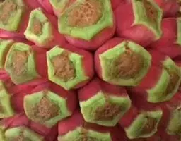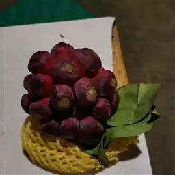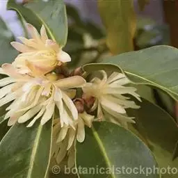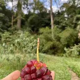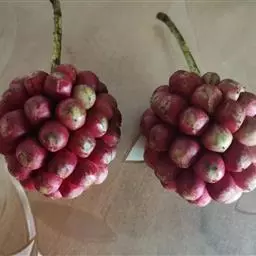 花被片 15~20 枚,暗红色或紫红色,常带有腺点,长 0.8~1.2 公分,宽 0.6~0.8 公分,仅在中间者最大,内及外层者较小:雄蕊多数,排成 3 列,心皮 12~16 枚,紧密排列呈压缩状,花柱锥形,长 0.1~0.2 公分。
