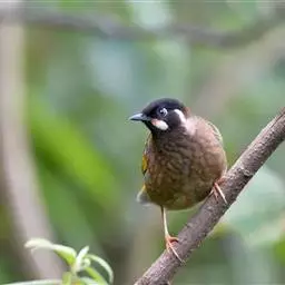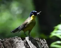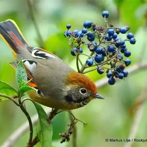 黑顶噪鹛:中型鸟类,体长24-26厘米。前额、脸、颏、喉黑色,头顶黑褐沾棕或深棕橄榄褐色,…