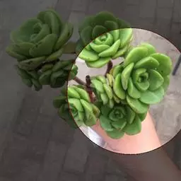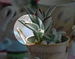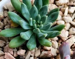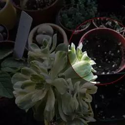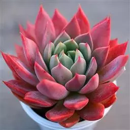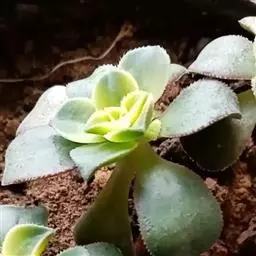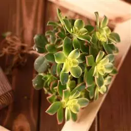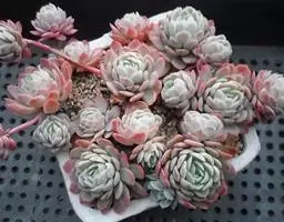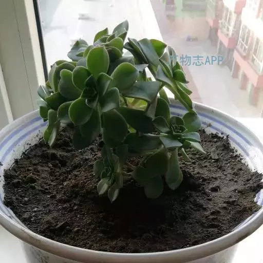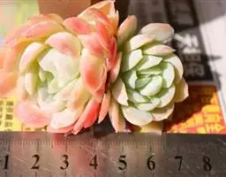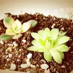 夕映 叶多肉,成基生叶丛,呈莲座状,叶片为扁平卵形,新生叶片总体为淡黄色,中心淡绿色,老叶黄色减少。夏季几乎完全为深绿色,秋冬季节绿色减淡,锦斑会变得较为模糊,充足光线下边缘会呈现橘红色至桃红色,成株直径约10-15厘米。极易产生分株,摘下分株晾干数日后扦插,即可成为新株。