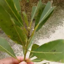 叶纸质,倒卵形或倒披针形,长4-8厘米,宽2-4厘米,幼态叶长达15厘米,宽达6厘米,上下两面均无毛,干后黑褐色,不发亮,先端钝,或略尖,基部窄楔形,下延,侧脉5-6对。在上面隐约可见,在下面稍突起,网脉不大明显,边缘有钝锯齿或波状钝齿;叶柄长1-1.5厘米,无毛。