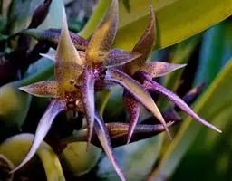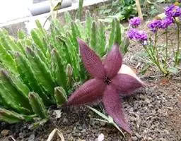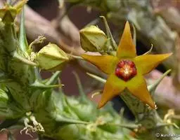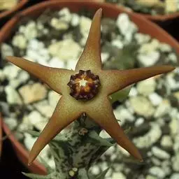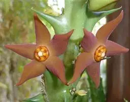 茎4棱,长20—40厘米,表皮橄榄绿或灰绿色,顶端有细小而早落的叶。花褐色,大1.3厘米,簇生于茎侧四面。水牛掌属植物通常表皮颜色暗淡并常有暗花纹,本种表皮色彩较明快并没有花纹,茎较细反,和常见水牛角属种类不同。适宜植物园及部分爱好者栽培。