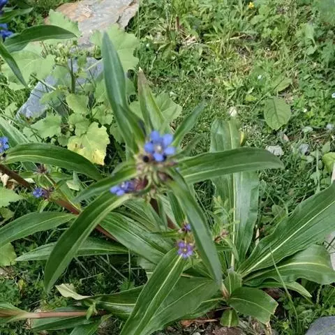 花单生枝顶,基部包围于上部茎生叶丛中,5数,稀6数;无花梗;花萼筒紫红色或黄绿色,长6-8毫米,裂片绿色,叶状,与上部茎生叶同形,长4-4.5毫米,弯缺狭,截形;花冠蓝色,具深蓝色条纹,狭漏斗形,长3.5-5厘米,喉部直径1.3-1.7厘米,裂片宽三角形,长2-3毫米,先端钝,具长1-2毫米的尾尖,全缘,褶整齐,截形或宽卵形,长1-1.5毫米,先端钝圆,边缘齿蚀形;雄蕊着生于冠筒下部,整齐,花丝钻形,长8-10毫米,下部突然加宽,基部向冠筒下延成翅,花药狭椭圆形,长2-2.5毫米;子房狭椭圆形,长9-11毫米,两端渐狭,柄长11-15毫米,花柱丝状,连柱头长6-7毫米,柱头2裂,裂片外卷,线形。