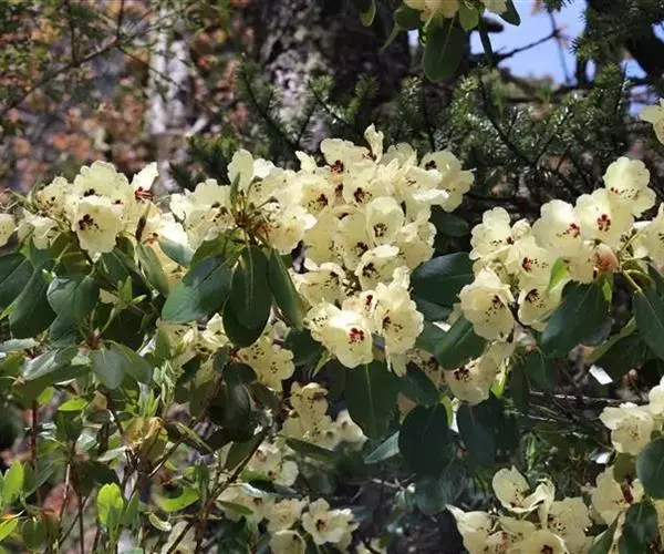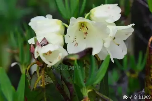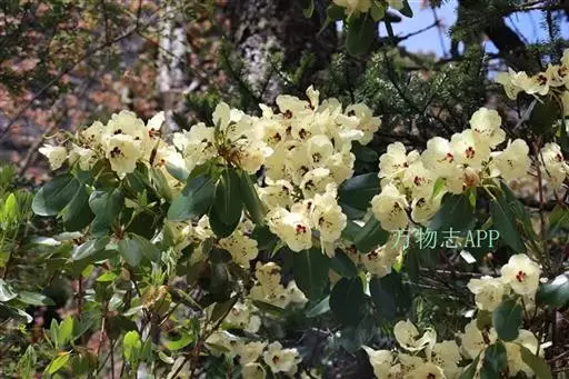 与黄杯杜鹃的主要区别:花冠纯白色,叶长卵形。花期5-6月。