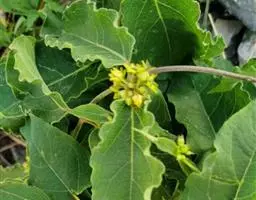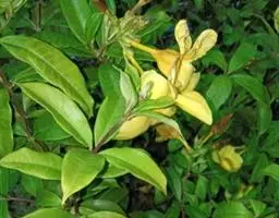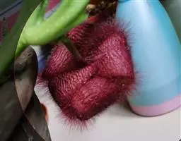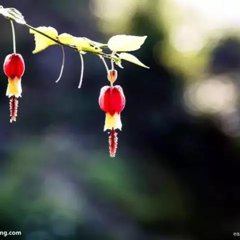 花朵自叶腋2厘米处生出,花较细长,壶状,颜色鲜艳,红褐色,长约2.5厘米。花托隆起,呈紫色。花后结出羊角状的果实。该种花期为春季、夏末至早秋,每朵花可持续开放约6周。 [7-9]