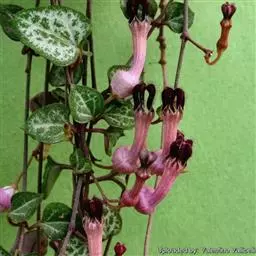 爱之蔓(学名:Ceropegia collaricorona ssp. collaricorona Werderm.)是萝藦科,吊灯花属多肉植物 Ceropegia collaricorona Werderm. 的指名亚种。多年生,植株从带有结节的块茎中生出并匍匐生长,块茎灰色,质地坚硬、有褶皱。从中萌生出数根紫色、线状的匍匐茎。该种会在叶腋处长出圆形块茎,称“零余子”,有贮存养分、水分及繁殖的功用。叶对生,肥厚肉质,呈心形;叶深绿色,叶面上有灰、白色网状花纹,叶背呈紫红色。花朵自叶腋生出,较细长,壶状,为鲜艳的红褐色。花托隆起,紫色。果实羊角状。