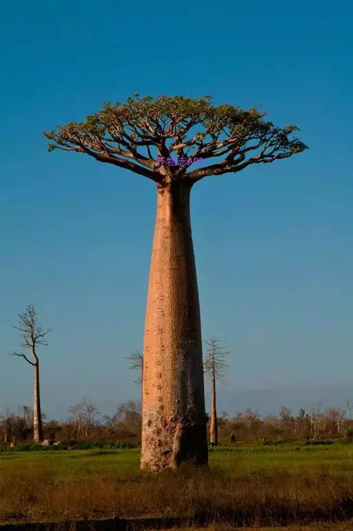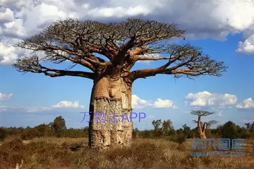 带叶时期的猴面包树 猴面包树还是植物界的老寿星之一,即使在热带草原那种干旱的恶劣环境中,其寿命仍可达5000年左右。据有关资料记载,18世纪,法国著名的植物学家阿当松在非洲见到一些猴面包树,其中最老的一棵已活了5500年。由于当地民间传说猴面包树是“圣树”,因此受到人们的保护。