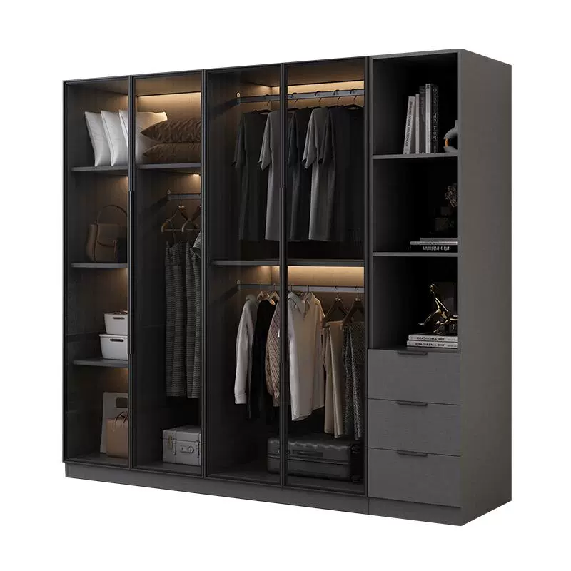由不同规格尺寸的双饰面板材组合而成。主要由面板、背板、侧板、脚线、门板构成。其中柜体内包含各种特色小部件有:拉蓝、L架、裤架、推拉镜、格子架、层板。
