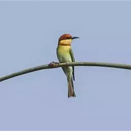 栗喉蜂虎是蜂虎科蜂虎属的鸟类。有热带鸟类羽毛艳丽的特征:喉部是栗红色的,黑色的过眼纹,…