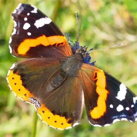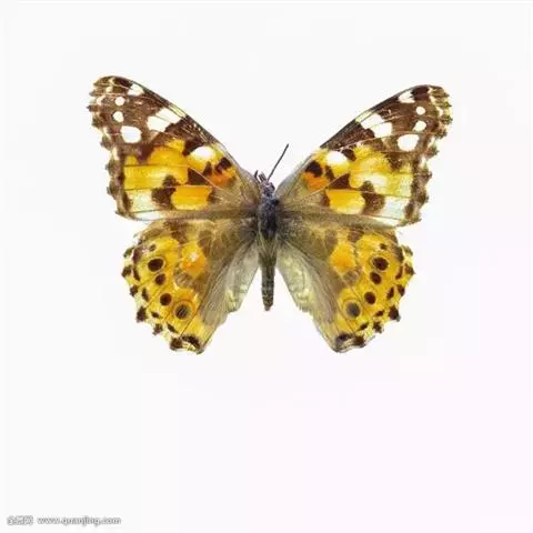大红蛱蝶Vanessa indica Herbst,翅黑褐色,外缘波状。前翅M1脉外伸成角状,…