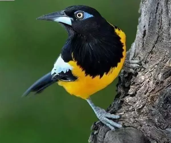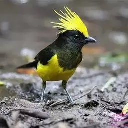 雌鸟额、头顶和羽冠亦为黄色,但羽色较暗淡而少光泽;头侧、枕后颈、颈侧、背、肩和尾上覆羽橄榄绿色。颏、喉、胸暗黄橄榄色,下余下体黄色,两翅和尾黑色微沾绿色。幼鸟和雌鸟相似,但羽冠不及成鸟长而显著。