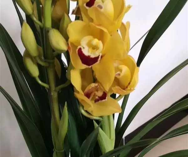 3.大花蕙兰花期养护:开花期最适温8℃至15℃,不能放于高温干燥的暖气旁边,花期3天浇水一次,长时间2℃至3℃的低温花则发生冻害,花苞变黄,不能开放,观赏期50至80天。